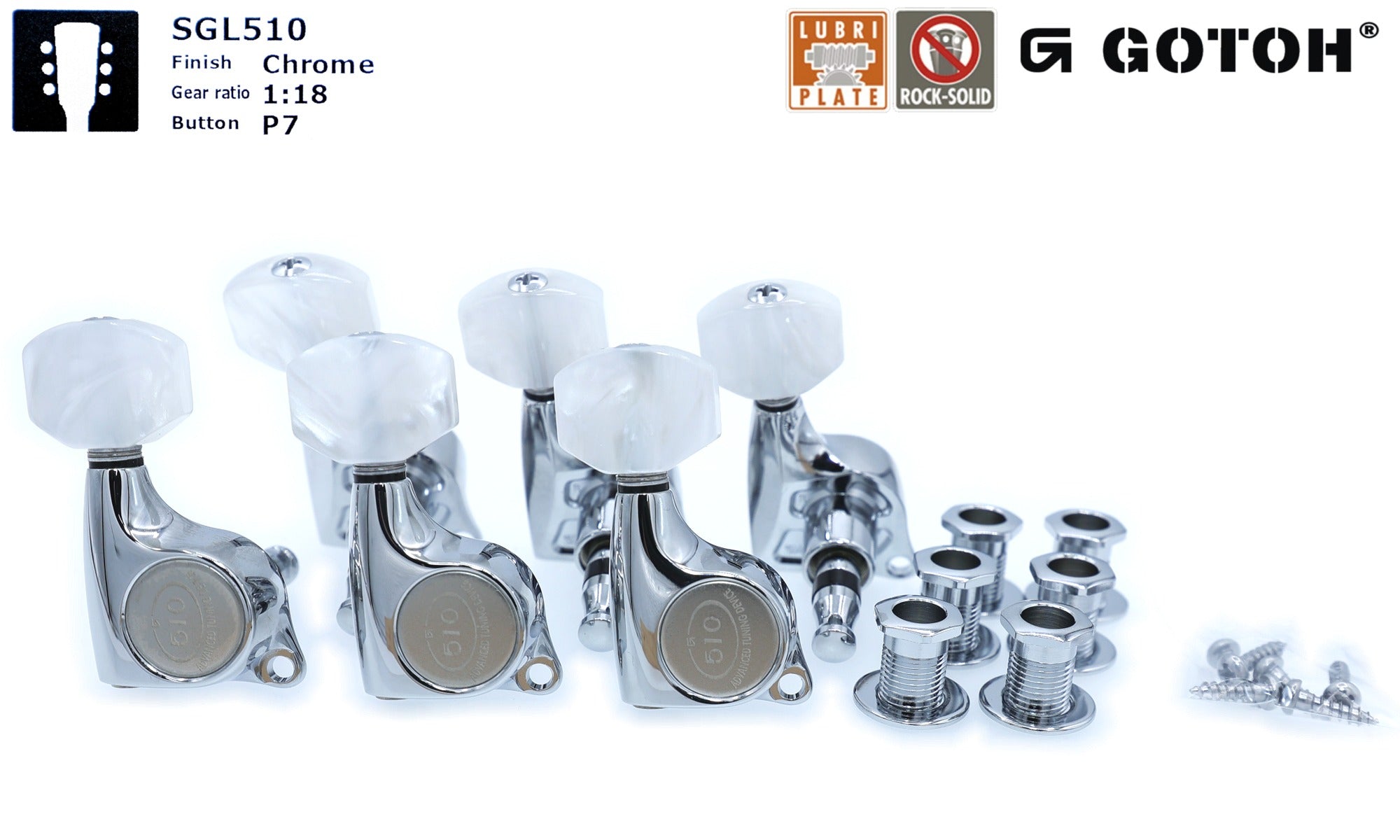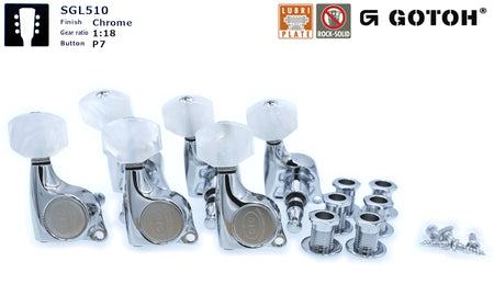Set of six Premium Lubri-Plated Gotoh SGL510 series sealed-gear tuners, Chrome finish (3L+3R).