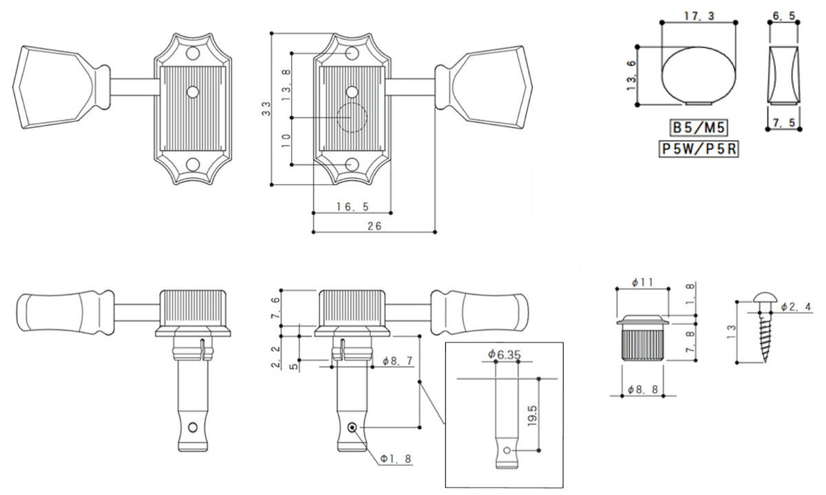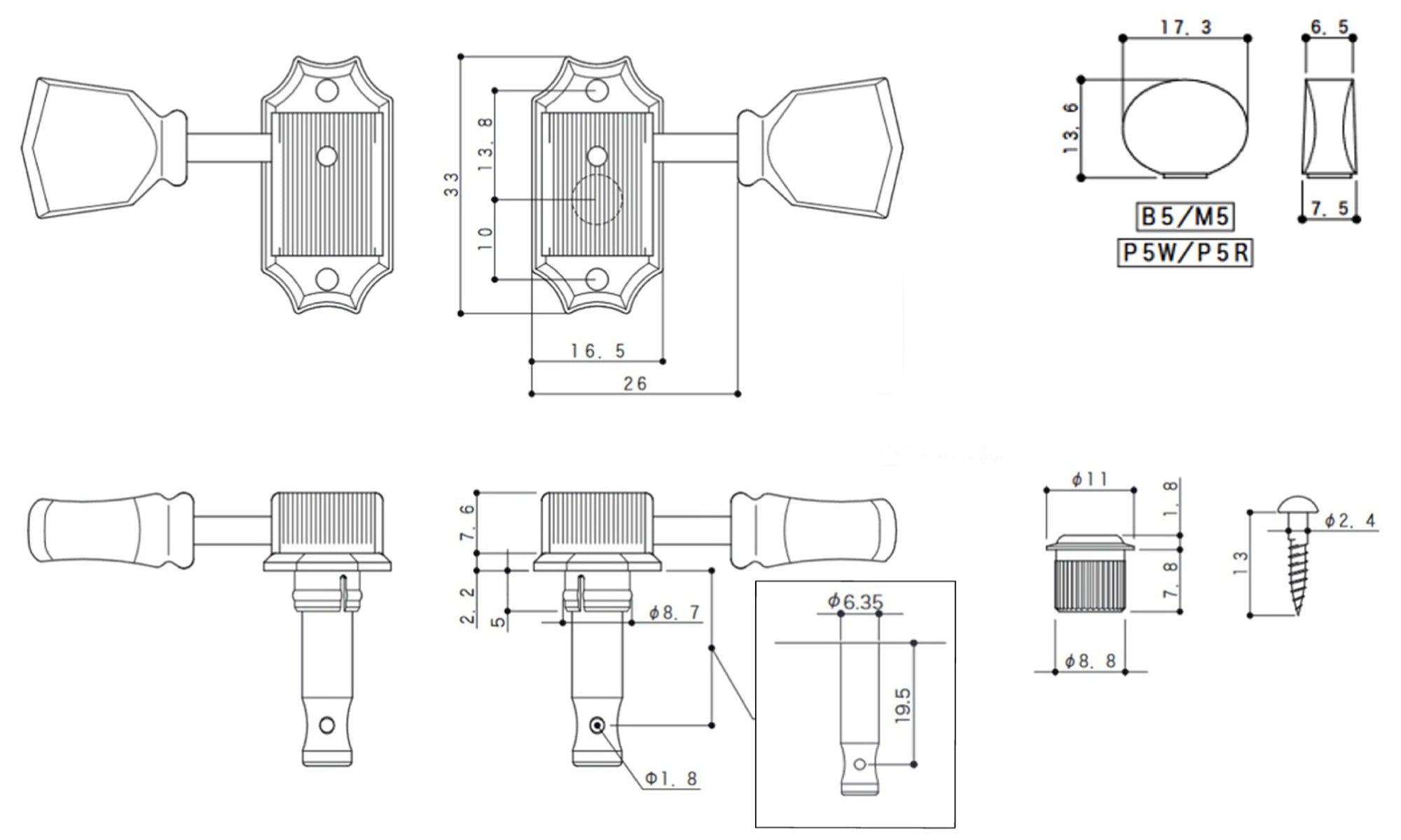 Vintage Closed-Back Tuners, Nickel Finish, Plastic knobs, complete set including C-A-R-D + bushings + screws.